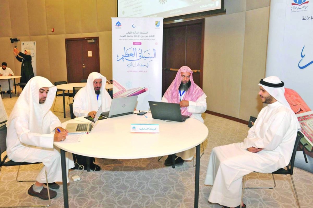 وسط مشاركة 24 طالبا وطالبة من فئة ذوي الإعاقة بجامعة الكويت، وبأجواء تنافسية ومحفزة، انطلقت، اليوم، في مركز المؤتمرات بمدينة صباح السالم الجامعية، المسابقة الرمضانية الأولى لطلبة ذوي الإعاقة، تحت شعار «السباق العظيم في حفظ القرآن الكريم»، التي نظمتها إدارة الرعاية الاجتماعية التابعة لعمادة شؤون الطلبة بجامعة الكويت، بالتعاون مع جمعية المنابر القرآنية.