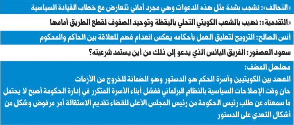 وأكمل البيان «إزاء هذه الدعوات الخطرة، فإنّ الحركة التقدمية الكويتية تهيب بالشعب الكويتي التحلي باليقظة وتوحيد صفوفه لقطع الطريق على مثل هذه التوجهات الخطرة والضارة، وإلزام السلطة بالإسراع في معالجة الأزمة المحتدمة ضمن إطار الالتزام بالدستور والمبادئ الديموقراطية، بدءاً من طيّ صفحة مجلس 2020 المرفوض شعبياً إلى غير رجعة فور تشكيل الحكومة، وعدم شرعنة وضعه الشاذ».