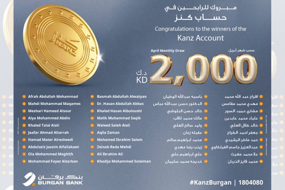 أعلن بنك برقان اليوم أسماء العشرين فائزا في السحب الشهري لحساب كنز، والذين سيحصل كل منهم على جائزة نقدية بقيمة 2000 دينار، ويدخل هذا السحب كل عملاء حساب كنز الذين يحافظون على رصيد أدنى قدره 200 دينار لمدة أسبوع على الأقل قبل تاريخ السحب، وتزداد فرصهم في الفوز كلما ازدادت إيداعاتهم في الحساب.