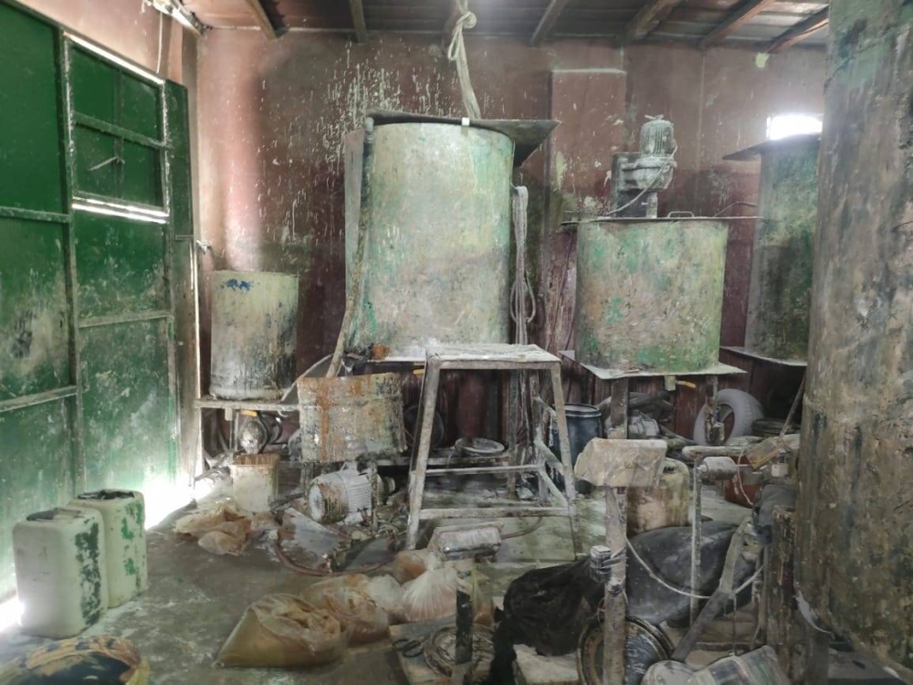 بتفتيش المصنع عُثر بداخله على 5 أطنان من بودرة السيراميك بدون بيانات، و5 أطنان قشر وكسر الفول السوداني، و2,5 طن سمسم، وطن دقيق و200 لتر زيت طعام.