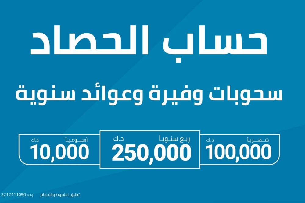 وتبقى الجوائز ربع السنوية الكبري بقيمة 250 ألف د. ك، نقدا للرابح هي أهم ما يطمح إليه العملاء، حيث تمثّل لهم فرصة حقيقية لتحقيق حلم العمر، وفضلا عن هذه الباقة من الجوائز الجذابة، هناك أيضاً أرباح سنوية متوقعة على أساس عقد الوكالة، وهو ما يزيد من جاذبية حساب الحصاد الإسلامي.