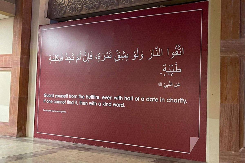 ومن الأحاديث التي وقع ترجمتها ووضعها على الجداريات «كل معروف صدقة» وحديث آخر للرسول محمد يقول فيه «اتقوا النار ولو بشق تمرة، فإن لم تجد فبكلمة طيبة».