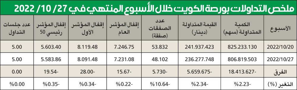 سجلت مؤشرات بورصة الكويت استقرارا جيدا خلال تعاملات الأسبوع الماضي واحتفظت بمعظم مكاسب شهر أكتوبر، وخسر مؤشر السوق العام نسبة 0.22 في المئة أي 15.67 نقطة ليقفل على مستوى 7231.08 نقطة بينما فقد مؤشر السوق الأول نسبة 0.34 في المئة أي 28 نقطة ليقفل على مستوى 8091.48 نقطة، وخسر مؤشر رئيسي 50 نسبة 0.35 في المئة أي 19.54 نقطة ليقفل على مستوى 5583.86 نقطة.