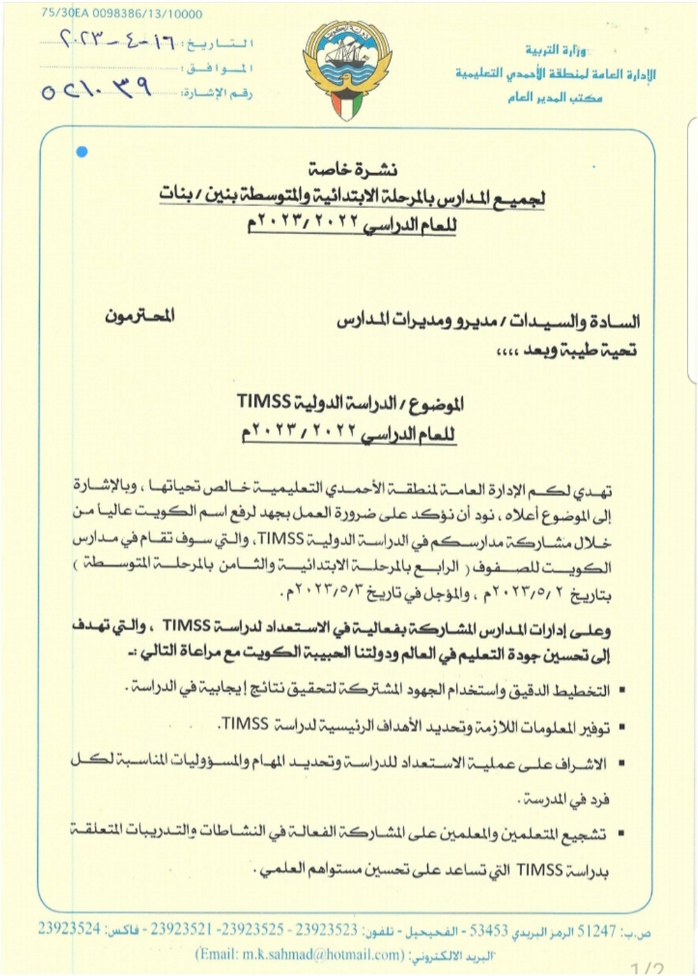 بينما تتجه وزارة التربية، بالتعاون مع المركز الوطني لتطوير التعليم، إلى تطبيق اختبارات دراسة Timss على طلبة الصفين الرابع والثامن بمادتي الرياضيات والعلوم 2 مايو المقبل، دعا المدير العام لمنطقة الاحمدي التعليمية وليد بن غيث الادارات المدرسية الى الاعداد الجيد للمشاركة الفعالة في هذه الاختبارات وتحقيق افضل النتائج.