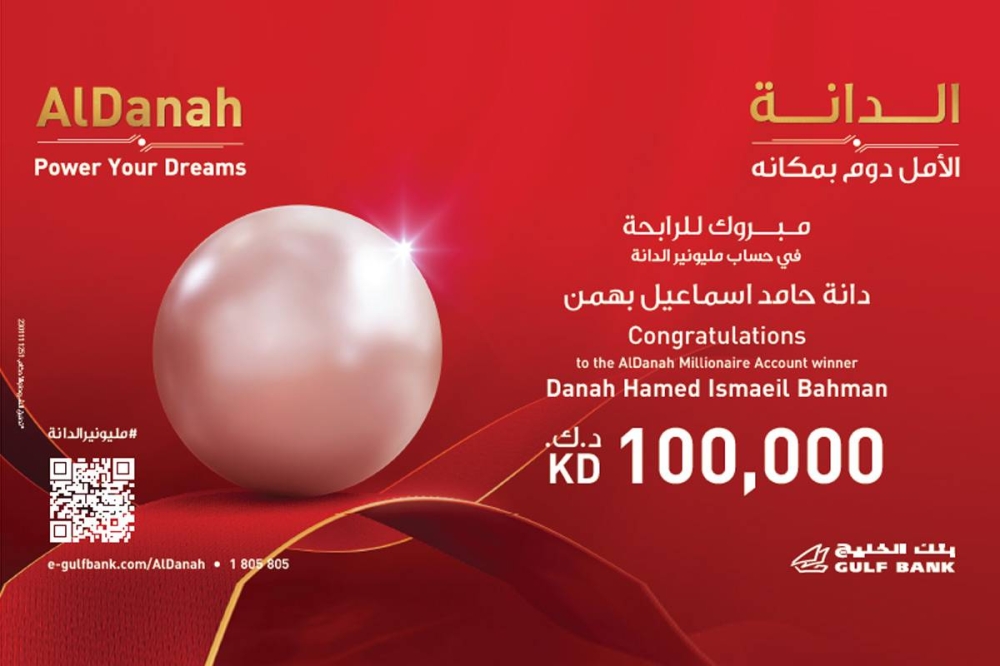 في إطار حرصه على مكافأة عملائه، أعلن بنك الخليج فوز دانة حامد إسماعيل بهمن بجائزة 100 ألف دينار، في السحب ربع السنوي لحساب مليونير الدانة، والذي جرى الخميس الماضي، بحضور ممثلي وزارة التجارة والصناعة وشركة إرنست آند يونغ.