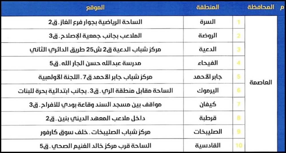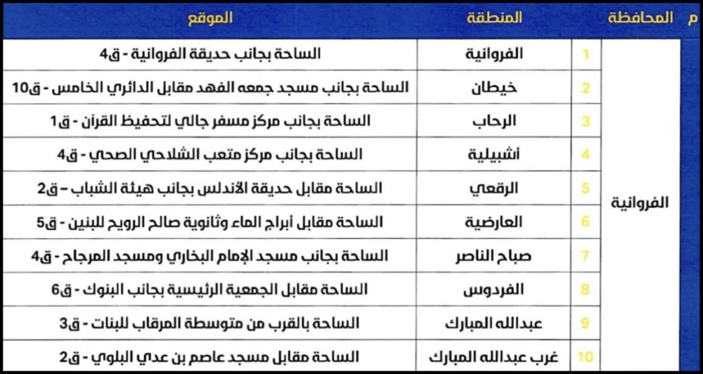 وذكرت الوزارة، في بيان صحافي أمس، أن وكيل الوزارة المساعد لشؤون قطاع المساجد صلاح الشلاحي أصدر تعميماً حدد فيه عدد الساحات ومراكز الشباب والملاعب الرياضية بمختلف المحافظات لاستقبال جمهور المصلين لأداء صلاة العيد فيها.