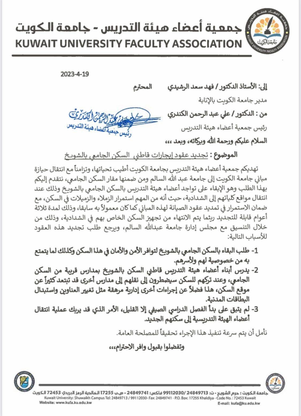 طالب رئيس جمعية أعضاء هيئة التدريس في جامعة الكويت، د. علي الكندري، مدير الجامعة بالانابة، د. فهد الدبيس، والأمين العام للجامعة، د. فايز الظفيري، بضرورة الإبقاء على أعضاء هيئة التدريس بالسكن الجامعي بالشويخ، لحين الانتهاء من مبناهم الجديد في الشدادية.