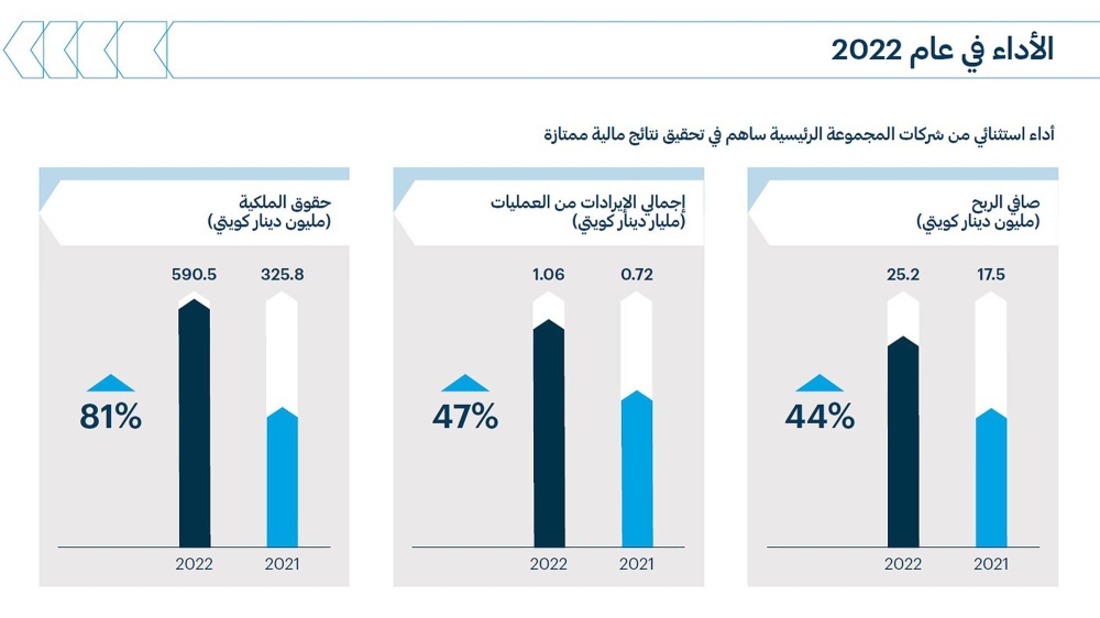من جهتها، حققت «سدافكو» أرباحاً صافية بقيمة 58.1 مليون دولار (17.8 مليون دينار) للأشهر التسعة الأولى من سنتها المالية (الفترة المنتهية في 31 ديسمبر 2022) بارتفاع نسبته 50 في المئة. أما شركة العقارات المتحدة فقد سجلت أرباحها نمواً بنسبة 168 في المئة لتصل إلى 3.4 ملايين دينار (11.1 مليون دولار)، كما ارتفعت الإيرادات من الرسوم لشركة كامكو إنفست بنسبة 2.5 في المئة.