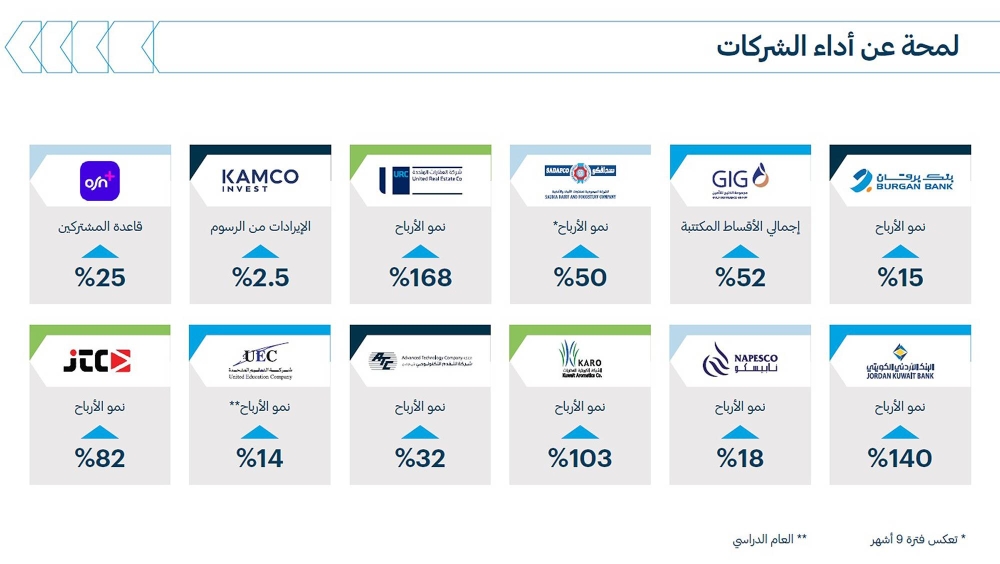 وسجلت أرباح البنك الأردني الكويتي نمواً بنسبة 140 في المئة، كما حققت الأرباح الصافية لشركة نابيسكو ارتفاعاً بنسبة 18 في المئة لتصل إلى 6.8 ملايين دينار (22.2 مليون دولار)، بينما سجلت الشركة الكويتية للعطريات ارتفاعاً بنسبة 103 في المئة في أرباحها الصافية لتبلغ 59 مليون دولار (18.1 مليون دينار). أما شركة التقدم التكنولوجي فقد حققت أرباحاً بقيمة 7 ملايين دينار (22.8 مليون دولار) بارتفاع نسبته 32 في المئة. كما سجلت أرباح شركة التعليم المتحدة نمواً بنسبة 14 في المئة.