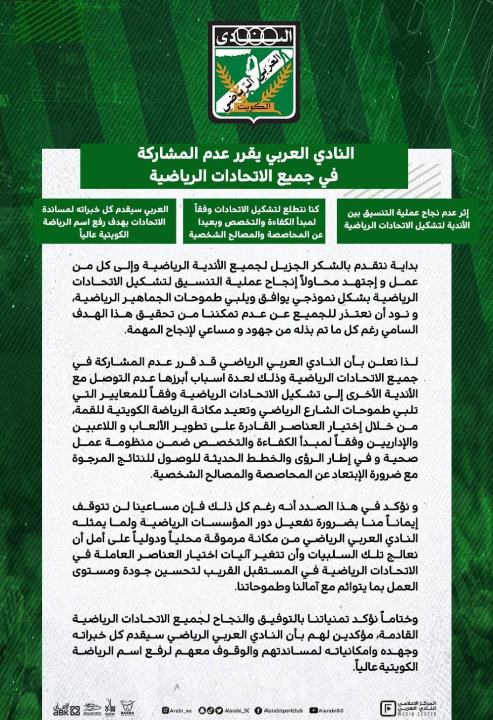 وقال النادي العربي في بيانه: «بداية نتقدم بالشكر الجزيل لجميع الأندية الرياضية، وإلى كل من عمل واجتهد، محاولاً إنجاح عملية التنسيق لتشكيل الاتحادات الرياضية بشكل نموذجي يوافق ويلبي طموحات الجماهير الرياضية، ونود أن نعتذر للجميع عن عدم تمكننا من تحقيق هذا الهدف السامي، رغم كل ما تم بذله من جهود ومساعٍ لإنجاح المهمة».