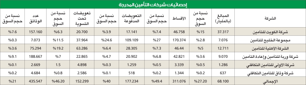وفيما يتعلق بالتعويضات المدفوعة، بلغت التعويضات المدفوعة من الشركات المدرجة لحملة الوثائق نحو 177.235 مليون دينار أي تشكل 40 في المئة من إجمالي التعويضات المدفوعة من الـ40 شركة في السوق الكويتي، التي تبلغ 442.890 مليون دينار، وتشكل نسبة 51.5 في المئة من إجمالي التعويضات المدفوعة من الـ 27 شركة محلية.