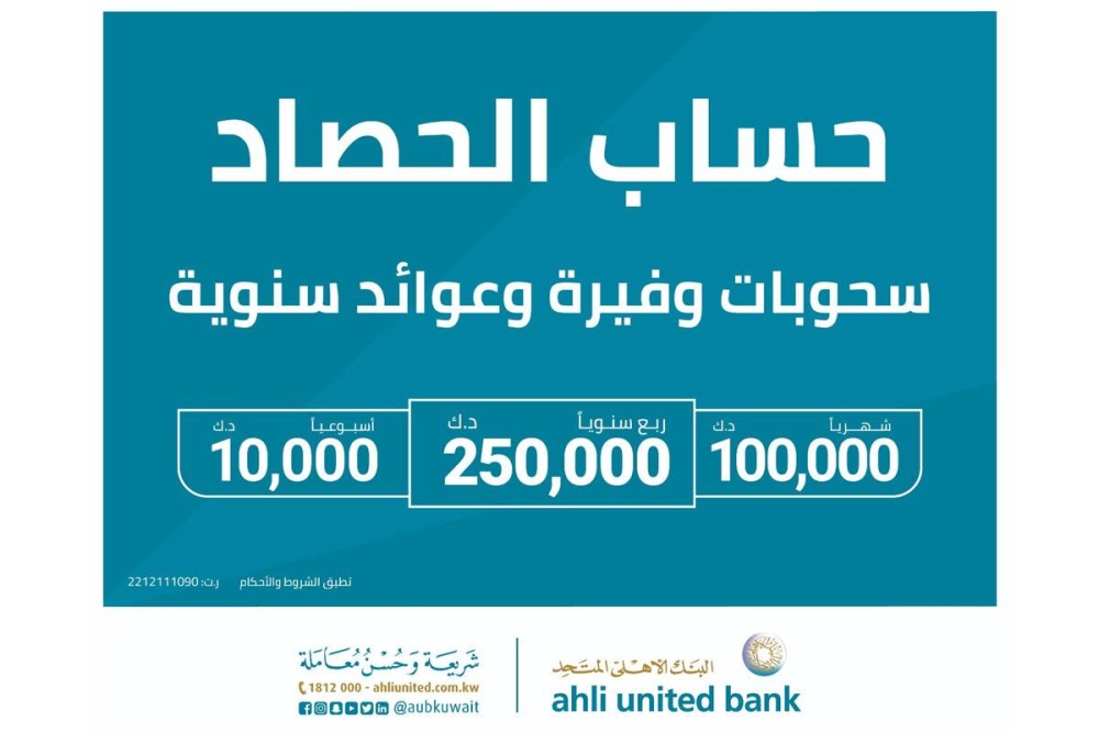 ويقدم حساب الحصاد الإسلامي في باقته الحالية مجموعة أوسع من المزايا، حيث يحظى الرابحون من عملاء «المتحد» بجائزة شهرية بقيمة 100.000 د.ك. بالإضافة إلى 10 جوائز أسبوعية بقيمة 1.000 دينار لكل جائزة. وتبقى الجوائز ربع السنوية الكبرى بقيمة 250.000 د.ك. نقداً للرابح هي أهم ما يطمح إليه العملاء، إذ تمثل لهم فرصة حقيقية لتحقيق حلم العمر.
