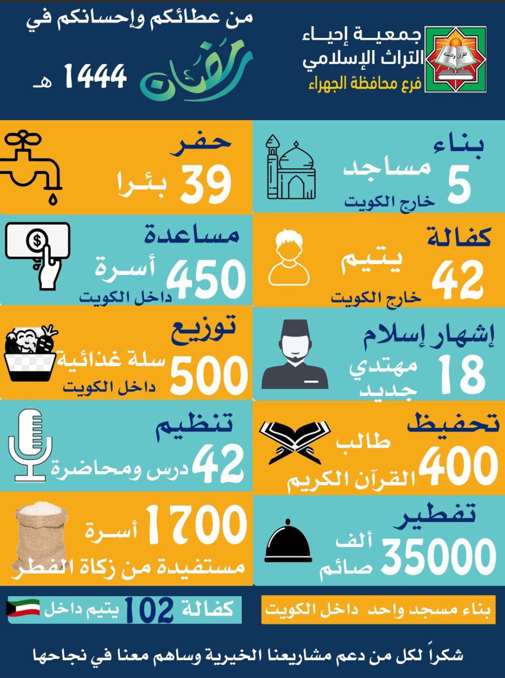 قالت جمعية إحياء التراث الإسلامي إنها قدمت إعانات مادية لـ 450 أسرة، وسلال غذائية لـ 500 أسرة، كما استفادت أكثر من 1700 أسرة من زكاة الفطر، وأكثر من 35 ألف شخص من مشروع إفطار الصائم، خلال شهر رمضان عبر فرعها في محافظة الجهراء.