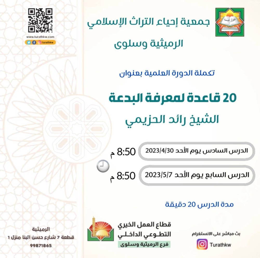 بدأت جمعية إحياء التراث الإسلامي دورة علمية متميزة بعنوان «20 قاعدة لمعرفة البدعة»، والتي تكون الدراسة فيها كل يوم أحد، لمدة 20 دقيقة في مقر فرع الرميثية.