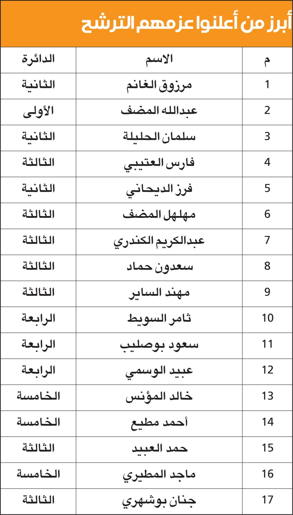 وكان أول المتصدرين كما نشرت «الجريدة» في عددها أمس رئيس مجلس الأمة السابق مرزوق الغانم، الذي أعلن ترشحه في دائرته الانتخابية الثانية، تلاه سعود بوصليب الذي أعلن خوضها في الرابعة وسلمان الحليلة في الثانية وعبيد الوسمي في الرابعة.