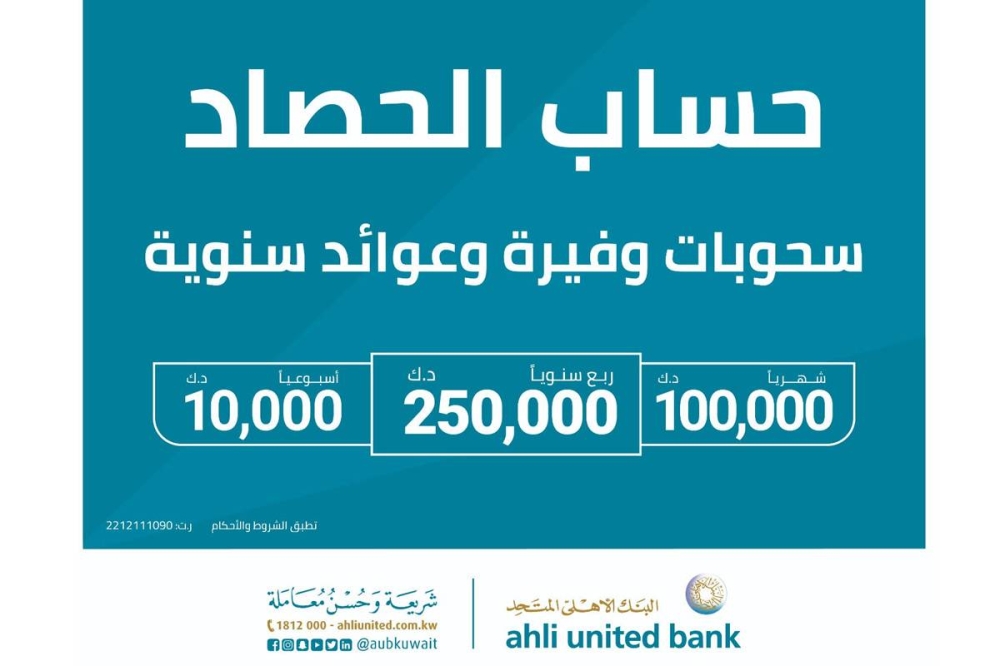 ويقدّم حساب الحصاد الإسلامي، في باقته الحالية، مجموعة أوسع من المزايا، حيث يحظى الرابحون من عملاء «المتحد» بجائزة شهرية بـ 100 ألف د. ك، إضافة إلى 10 جوائز أسبوعية بـ 1000 دينار لكل جائزة.
