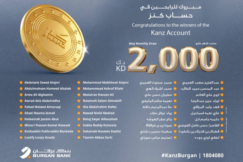 أعلن بنك برقان اليوم أسماء العشرين فائزا في السحب الشهري لحساب كنز، والذين سيحصل كل منهم على جائزة نقدية بقيمة 2000 دينار، ويدخل هذا السحب كل عملاء حساب كنز الذين يحافظون على رصيد أدنى قدره 200 دينار لمدة أسبوع على الأقل قبل تاريخ السحب، وتزداد فرصهم في الفوز كلما ازدادت إيداعاتهم في الحساب.