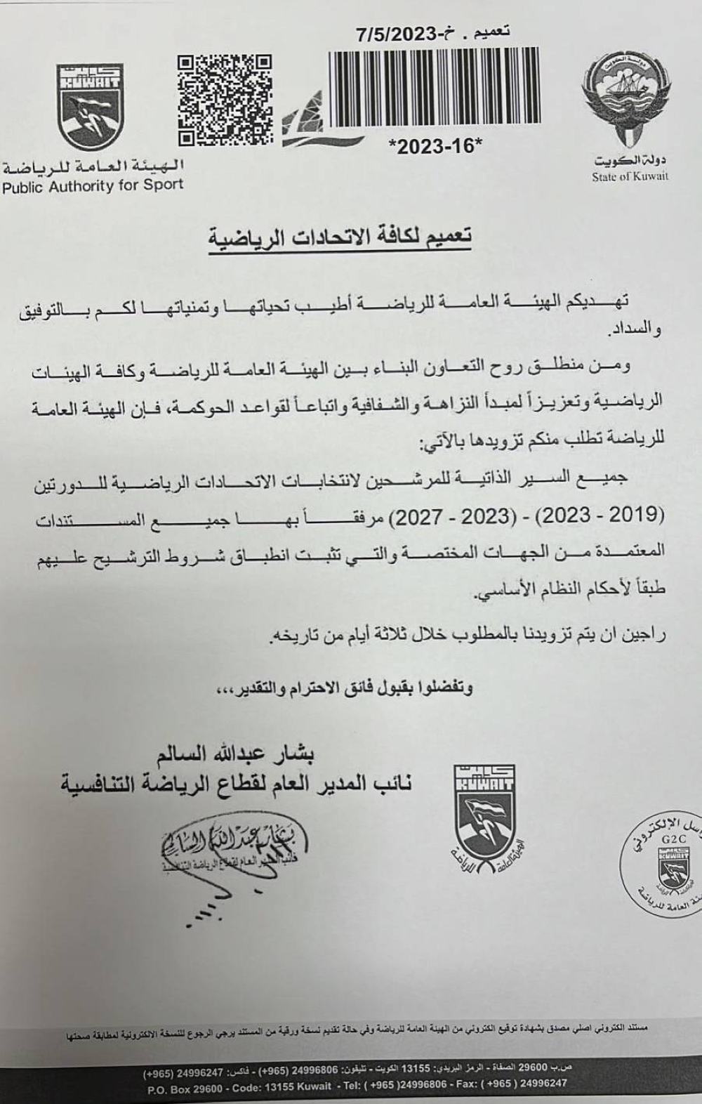 في الوقت الذي دفع رؤساء الأندية الاتحادات الرياضية، بصفتهم الجمعيات العمومية، إلى تجاهل الرد على طلب الهيئة العامة للرياضة بشأن تزويدها بالسير الذاتية لأعضاء الاتحادات للدورة 2019-2023 ومرشحي الاتحادات للدورة 2023-2027، بحجة عدم قانونية طلب الهيئة باعتباره تدخلا حكوميا في عمل الأندية والاتحادات، أكد مصدر مسؤول في الهيئة لـ«الجريدة» أن الطلب الموجه للاتحادات يأتي من صلب عمل الهيئة الرقابي، والذي يعطيها الحق بالتأكد من صحة انطباق شروط العضوية على أعضاء مجالس إدارات الاتحادات الرياضية، باعتبار أن الهيئة هي الجهة المنوط بها اعتماد تشكيل تلك المجالس والقرارات التي تصدر عن أعضائها، خصوصا في الجانب المالي، بدءا من طلب الدعم للاتحادات، ومرورا بالتعاقد مع أجهزة فنية وإدارية، وانتهاء بطلبات صرف ميزانيات المعسكرات الرياضية أو المشاركات الخارجية.