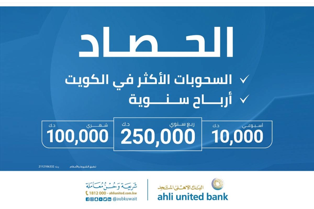 ضمن برنامج الحصاد الإسلامي، حساب السحب الأول على الجوائز الذي يقدمه البنك الأهلي المتحد، يجري البنك غدا السحب الشهري الذي يترقبه عملاء الحصاد الإسلامي لإعلان الرابح سعيد الحظ الذي سيفوز بالجائزة البالغة قيمتها 100000 دينار، تحت إشراف وحضور ممثلي وزارة التجارة في المبنى الرئيسي للبنك.