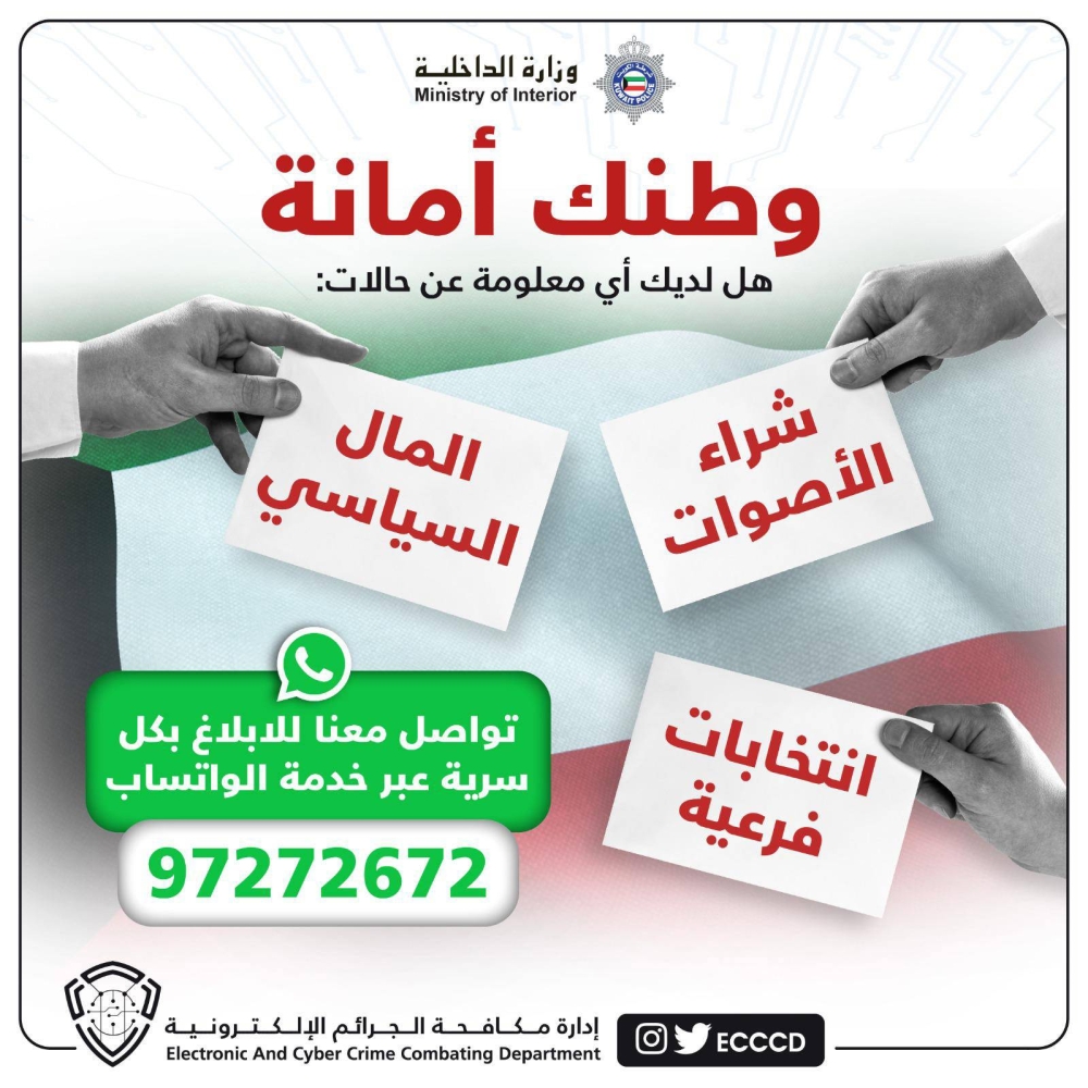 قالت الإدارة العامة للعلاقات العامة والإعلام الأمني بوزارة الداخلية، إنه من منطلق الواجب الوطني، فإن قطاع الأمن الجنائي بوزارة الداخلية، ممثلا بالإدارة العامة للمباحث الجنائية خصص خطا ساخنا للتواصل مع المواطنين للإدلاء بكل المعلومات الجدية بخصوص انتخابات مجلس الأمة 2023 وعمليات شراء الأصوات، وأي حالات مخالفة للقانون، وذلك من منطلق أن «كل مواطن خفير»، مع تأكيد أن التعامل مع المعلومات المرسلة سيكون بسريّة تامة، مشيراً إلى أن خط التواصل هو 97272672.