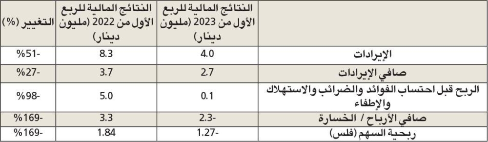 وقد بلغت الإيرادات التشغيلية للشركة 4.0 ملايين للربع الأول المنتهي في 31 مارس الماضي، أي ما يعادل انخفاضاً بنسبة 51 بالمئة مقارنة بنفس الفترة من عام 2022.