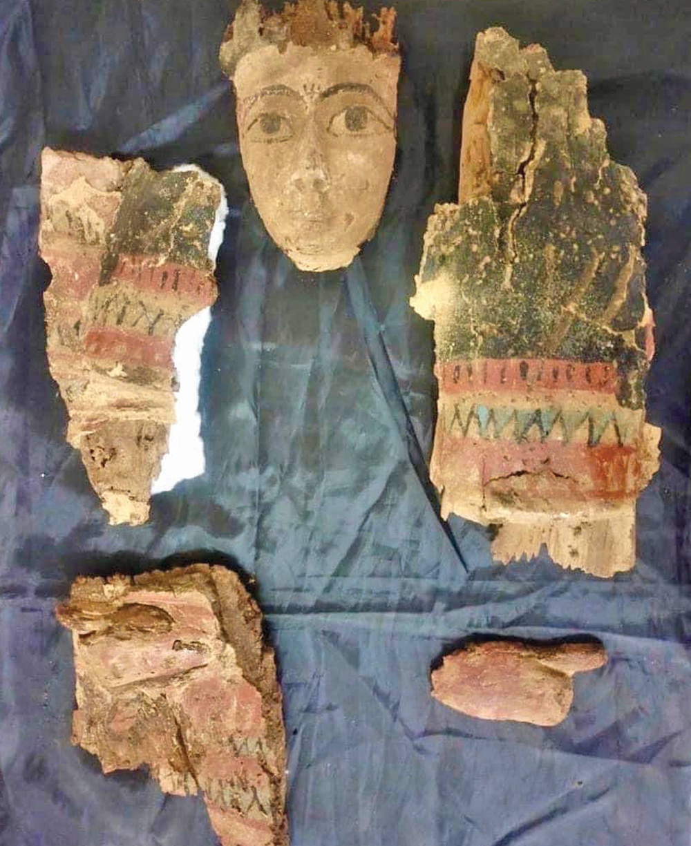 وتابع: «أحد هذه المدافن يخص سيدة، وقد عُثر داخل بنايتها على التابوت الخاص بها في حالة سيئة، إذ لم يبق منه إلا قناع وكفّان وأجزاء من الصدر».