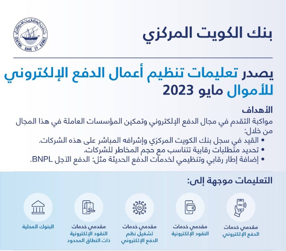 أصدر بنك الكويت المركزي تعليمات تنظيم أعمال الدفع الإلكتروني للأموال «مايو 2023» بشكلها النهائي كنسخة محدثة عن تعليمات تنظيم أعمال الدفع الإلكتروني للأموال الصادرة في عام 2018، بعد الانتهاء من دراسة جميع المرئيات والملاحظات المقدمة على مسودة التعليمات الجديدة التي طرحها «المركزي» في بداية عام 2022.