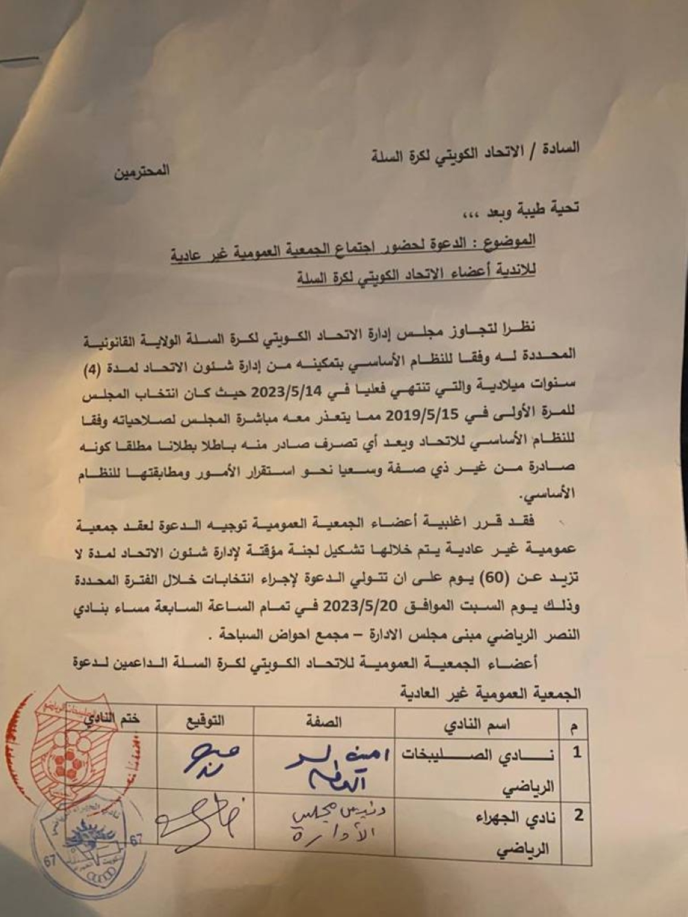 جدير بالذكر ان الاندية التي طلبت من الاتحاد بدعوة الجمعية العمومية الاسبوع الماضي هي الكويت والنصر والجهراء والصليبيخات والتضامن وبرقان والشباب.