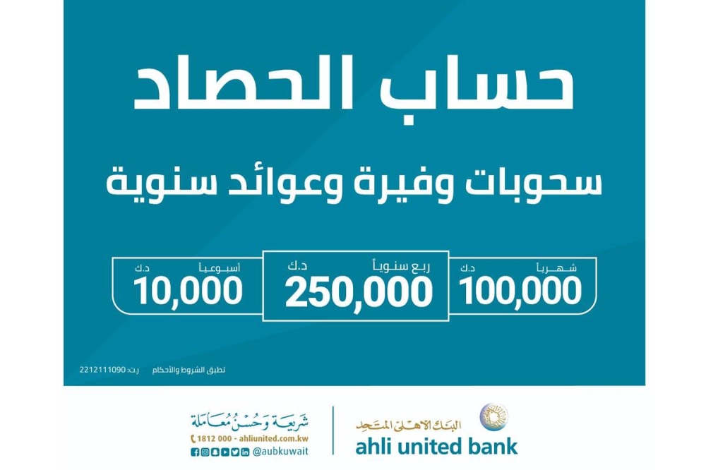 ويقدم حساب الحصاد الإسلامي في باقته الحالية مجموعة أوسع من المزايا، إذ يحظى الرابحون من عملاء المتحد بجائزة شهرية بقيمة 100.000 د.ك، إضافة إلى 10 جوائز أسبوعية بقيمة 1.000 د.ك، لكل جائزة. وتبقى الجوائز الربع السنوية الكبرى بقيمة 250.000 د.ك. نقداً للرابح هي أهم ما يطمح إليه العملاء، حيث تمثل لهم فرصة حقيقية لتحقيق حلم العمر. وفضلاً عن هذه الباقة من الجوائز الجذابة، هناك أيضاً أرباح سنوية متوقعة على أساس عقد الوكالة، وهو ما يزيد من جاذبية حساب الحصاد الإسلامي.