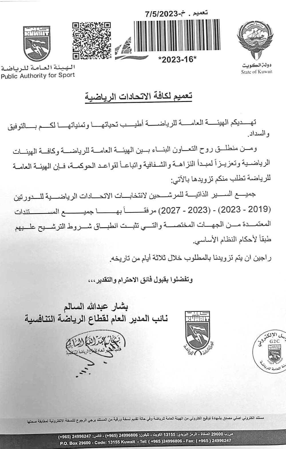 وكانت الهيئة أرسلت بتاريخ 7-5- 2023 تعميماً إلى الاتحادات الرياضية، طالبت خلاله بتزويدها بالسير الذاتية للمرشحين لانتخابات مجلس الإدارة للدورتين 2019 إلى 2023، و2023 إلى 2027.
