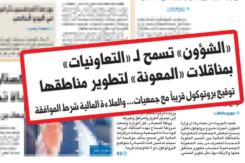 تأكيداً لخبر «الجريدة» المنشور في عددها الصادر بتاريخ 10 الجاري بعنوان («الشؤون» تسمح لـ «التعاونيات» بمناقلات «المعونة» لتطوير مناطقها)، كشف مصادر مسؤولة في وزارة الشؤون، أن مشروع البروتوكول التعاون، الذي ستطلقه الوزارة قريباً، ويسمح لبعض الجمعيات التعاونية بالمناقلة المالية بين النسب المئوية المحددة للصرف من بند «الخدمة الاجتماعية» لحساب تطوير مناطق عملها والارتقاء بها، تضمن إعادة توزيع هذه البنود واستحداث أخرى جديدة للارتقاء بالمناطق السكنية التابعة للجمعيات، مشيرة إلى أنه من بين هذه البنود الجديدة تخصيص ما نسبته 24 في المئة للصرف على الزراعات التجميلية لمناطق عمل التعاونيات.