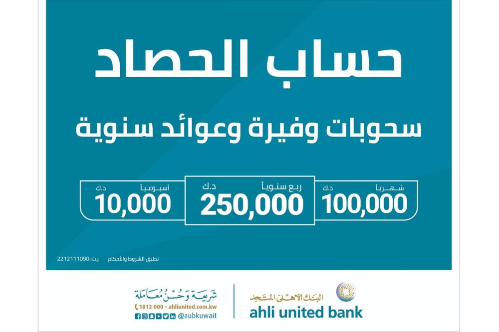 يقدّم حساب الحصاد الإسلامي في باقته الحالية مجموعة أوسع من المزايا، حيث يحظى الرابحون من عملاء البنك بجائزة شهرية بقيمة 100 ألف د. ك، إضافة إلى 10 جوائز أسبوعية بـ 1000 دينار لكل جائزة. وتبقى الجوائز ربع السنوية الكبرى بـ 250 ألف د. ك. نقدا للرابح هي أهم ما يطمح إليه العملاء، حيث تمثّل لهم فرصة حقيقية لتحقيق حلم العمر. وفضلا عن هذه الباقة من الجوائز الجذابة، هناك أيضاً أرباح سنوية متوقعة على أساس عقد الوكالة، وهو ما يزيد من جاذبية حساب الحصاد الإسلامي.
