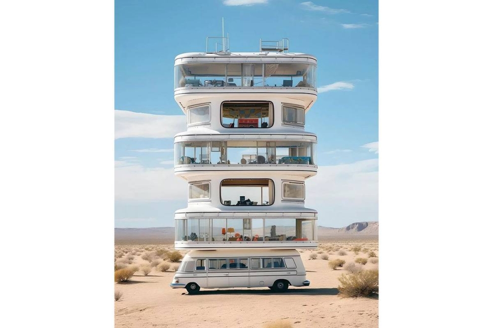 يظهر في الصورة ما يبدو أنّها حافلة متعددة الطوابق تضمّ مساكن. وجاء في التعليق المرافق لها «اليابان تصنع عمارة متنقله من خمسة طوابق».
