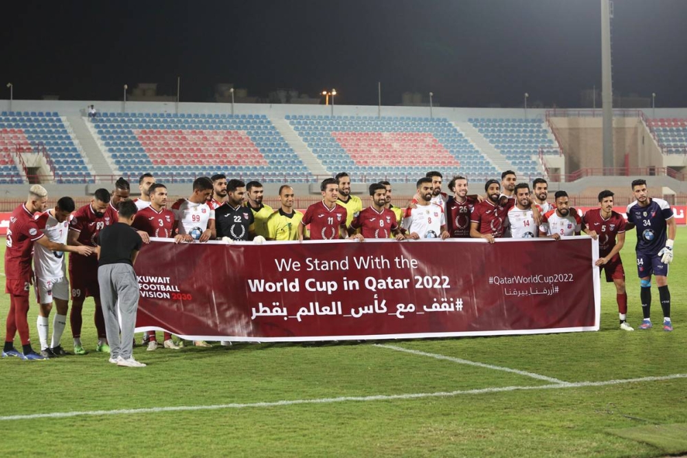 | أطلق الاتحاد الكويتي لكرة القدم حملة أمس تحت عنوان «نقف مع كأس العالم بقطر»، وذلك من أجل مساندة دولة قطر الشقيقة في استضافتها لمونديال 2022 الشهر الجاري. ورفع لاعبو النصر والكويت لافتة قبل انطلاق مباراتهما أمس حملت نفس العنوان. |
