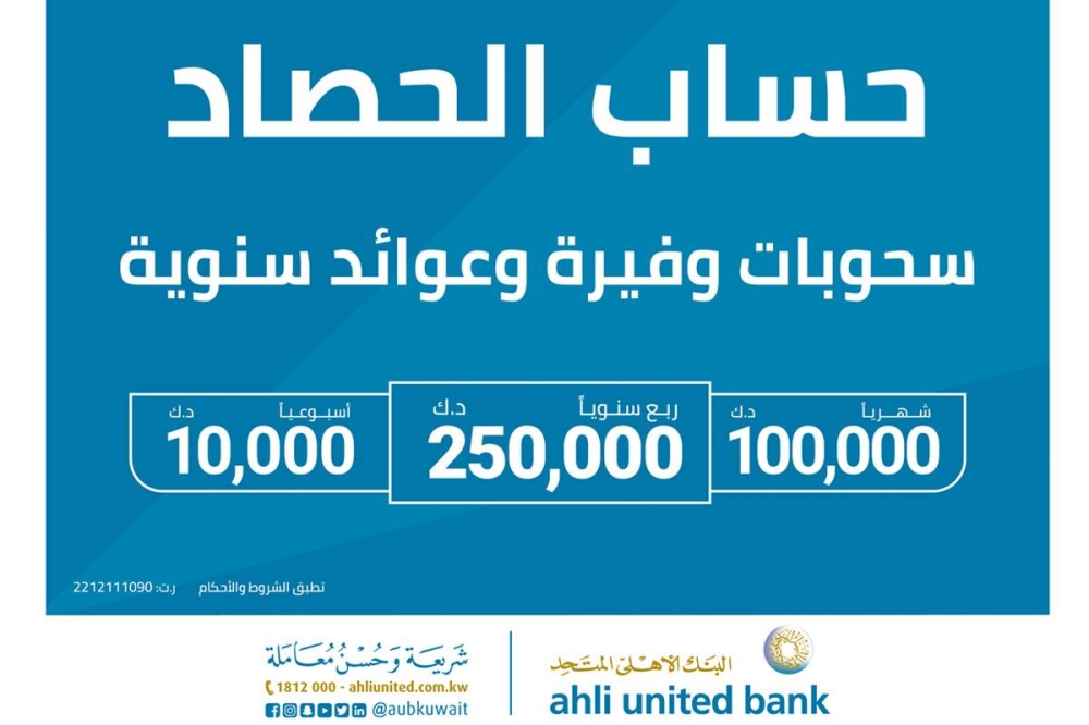 وتبقى الجوائز ربع السنوية الكبري بقيمة 250.000 د.ك. نقداً للرابح هي أهم ما يطمح إليه العملاء، حيث تمثل لهم فرصة حقيقية لتحقيق حلم العمر، وفضلا عن هذه الباقة من الجوائز الجذابة، هناك أيضاً أرباح سنوية متوقعة على أساس عقد الوكالة، وهو ما يزيد من جاذبية حساب الحصاد الإسلامي.
