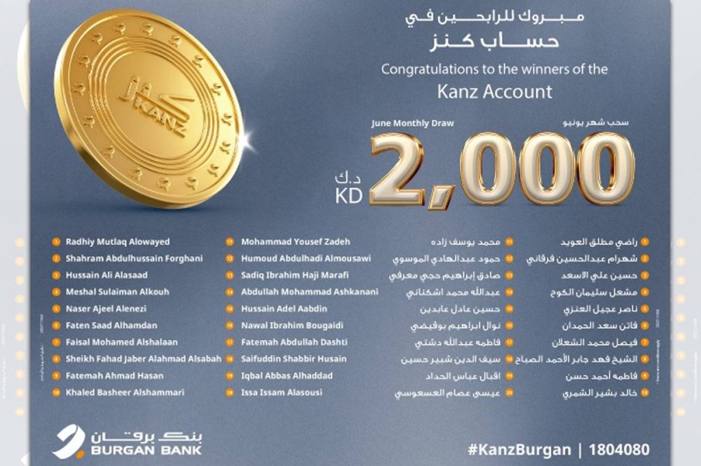 أعلن بنك برقان اليوم أسماء الفائزين العشرين في السحب الشهري لحساب كنز، والذين سيحصل كل منهم على جائزة نقدية بقيمة 2000 دينار. يدخل هذا السحب كل عملاء حساب كنز الذين يحافظون على رصيد أدنى قدره 200 دينار لمدة أسبوع على الأقل قبل تاريخ السحب، وتزداد فرصهم في الفوز كلما ازدادت إيداعاتهم في الحساب.