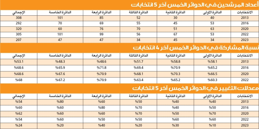 الانتخابات تعتبر السادسة بنظام الصوت الواحد والثامنة وفق نظام الدوائر الخمس، فبموجب احصائية أعدتها «الجريدة» لاخر 5 انتخابات أجريت وفق هذا النظام، بلغت نسبة المشاركة في مجلس 2022 نحو 68% فيما كانت 68.6% في مجلس 2020 وفي مجلس 2016 بلغت النسبة ذاتها بعد أن كانت 53% في مجلس 2013، أما من حيث نسبة التغيير فقد بلغت 54% في مجلس 2022 و62% في مجلس 2020 بينما كانت 60% بمجلس 2016 و54% بمجلس 2013.