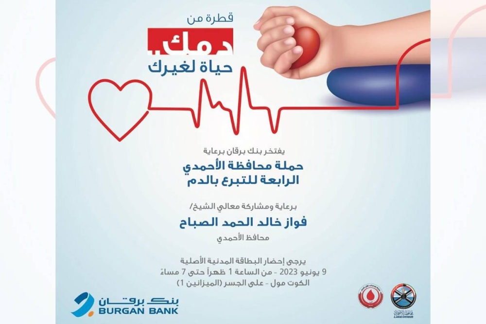 يرعى بنك «برقان» حملة محافظة الأحمدي للتبرع بالدم للسنة الرابعة على التوالي، ويشارك في فعالياتها التي ستُقام في مجمّع الكوت بتاريخ 9 يونيو 2023، تحت شعار «قطرة من دمك... حياة لغيرك».