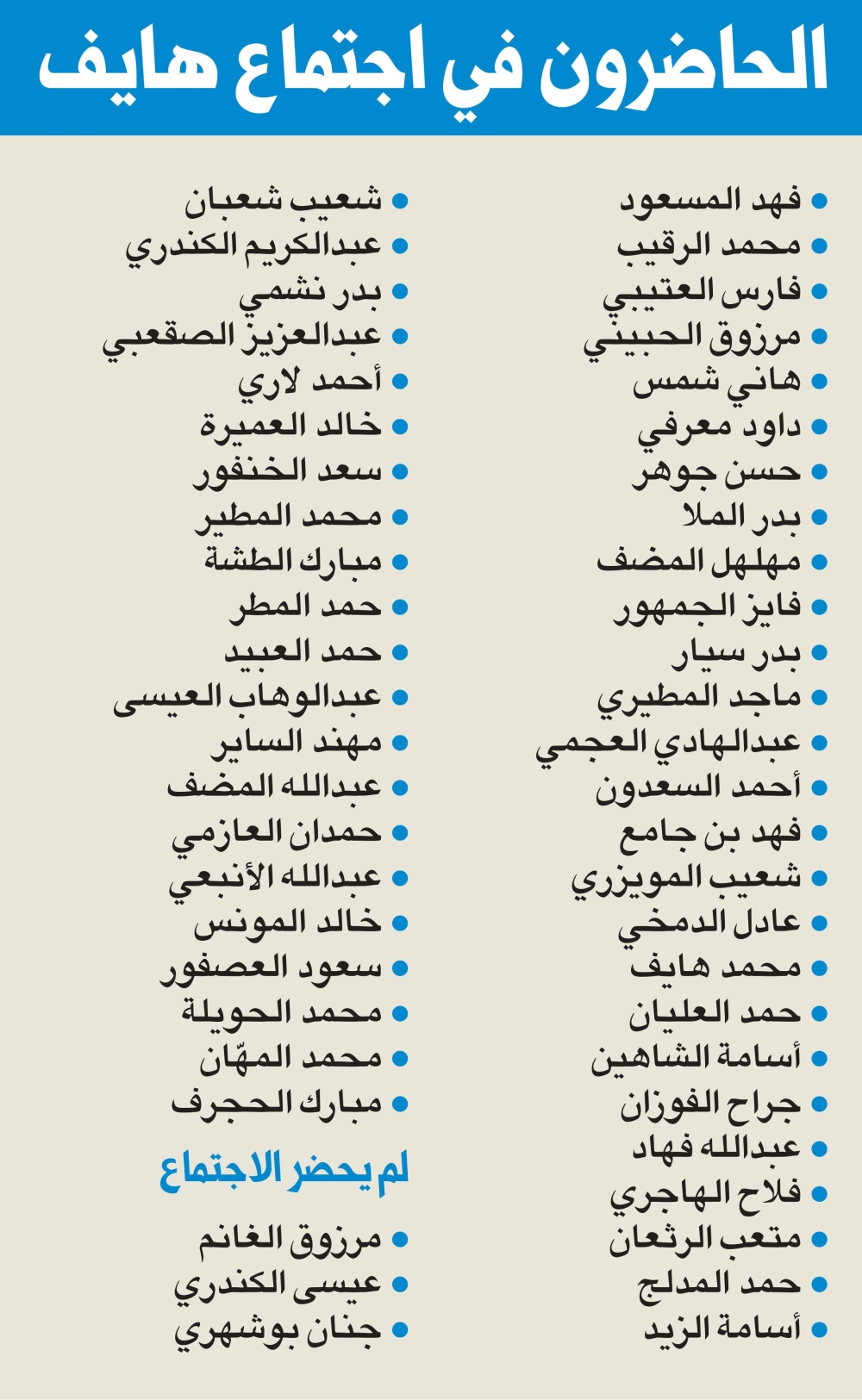 ووصف هايف حضور الاجتماع بالتاريخي، «إذ لم يحصل من قبل ويدل على استشعار النواب أهمية المسؤولية الملقاة على عاتقهم وأهمية هذه المرحلة السياسية الحرجة من عمر الكويت»، مشيراً إلى حضور 47 نائباً، واعتذار النائب عيسى الكندري لظروفه الصحية.