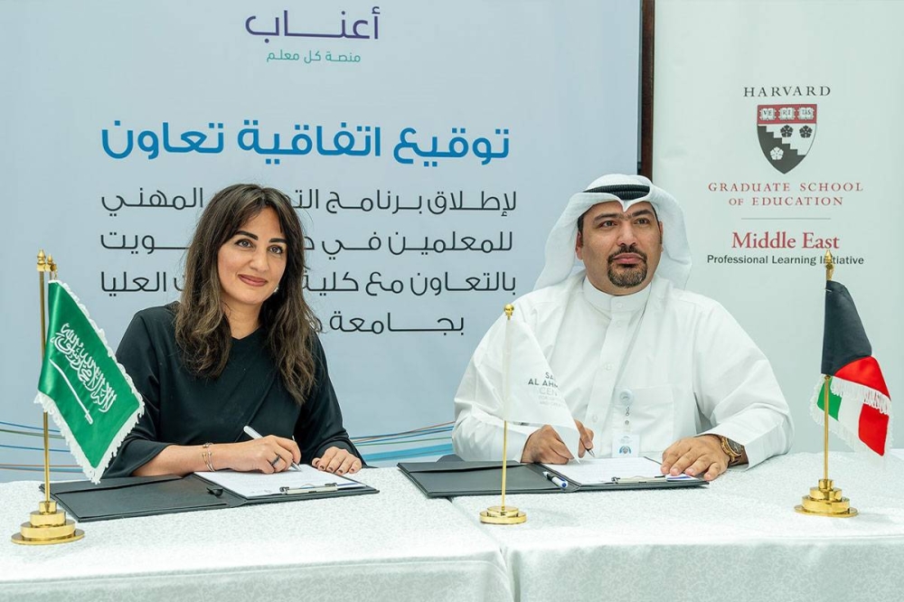 وقع مركز صباح الأحمد للموهبة والإبداع، التابع لمؤسسة الكويت للتقدم العلمي، اتفاقية تعاون مع منصة «أعناب» السعودية، لإطلاق برنامج التطوير المهني للمعلمين في الكويت، بالتعاون مع كلية الدراسات العليا للتعليم في جامعة هارفارد الأميركية.