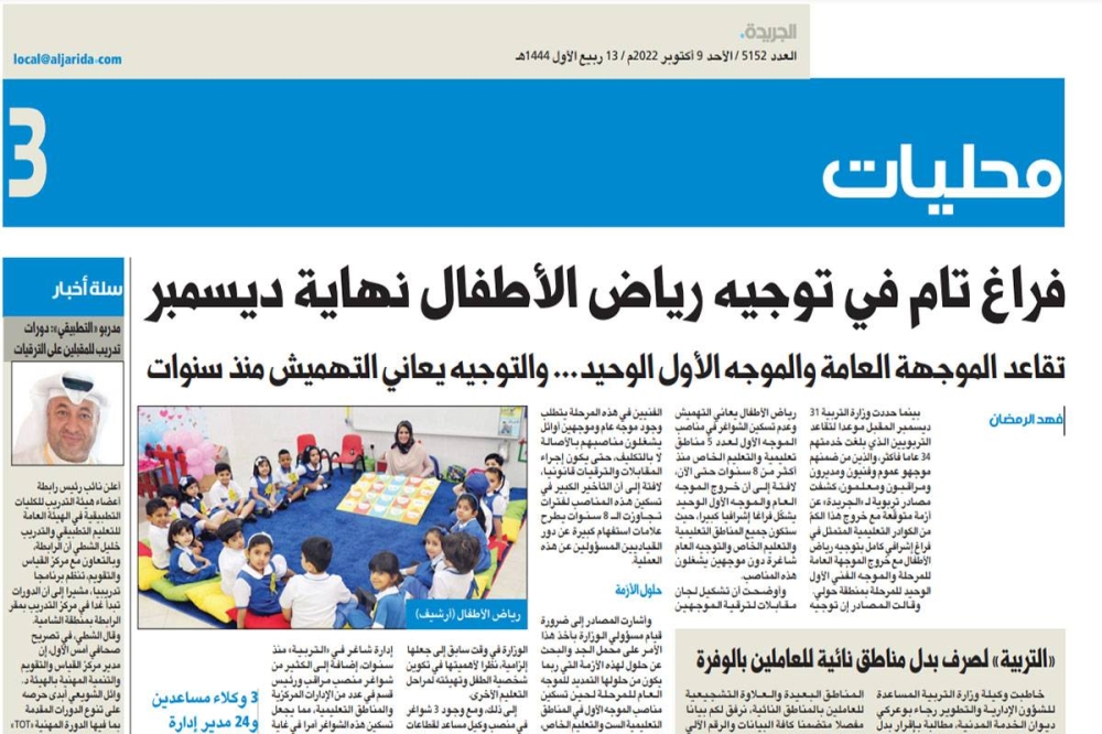رغم مرور أكثر من 6 أشهر على مقابلات موجهات رياض الأطفال التي تمت لاختيار 7 منهن موجهات أوائل للمناطق التعليمية الست والتعليم الخاص لتسكين الأماكن الشاغرة منذ ما يزيد على 6 سنوات، لا تزال وزارة التربية تماطل في إعلان الناجحات في هذه المقابلات وإصدار قراراتهن رغم وجود حاجة ماسة لتعيينهن.
