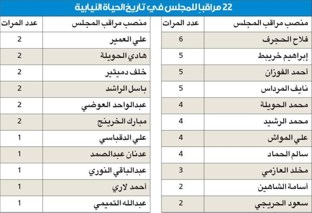 ووفقاً للمادة 33 من اللائحة الداخلية لمجلس الأمة، يتم اختيار مراقب مجلس الأمة في الجلسة الافتتاحية، وتصدّر فلاح الحجرف النواب الذين تقلدوا منصب المراقب، حيث فاز بالمنصب 6 مرات، يليه كل من أحمد الفوزان وإبراهيم خريبط ونايف المرداس 5 مرات، ومحمد الرشيد وعلي المواش وسالم الحماد ومحمد هادي الحويلة 4 مرات، والنائب مخلد العازمي 3 مرات.
