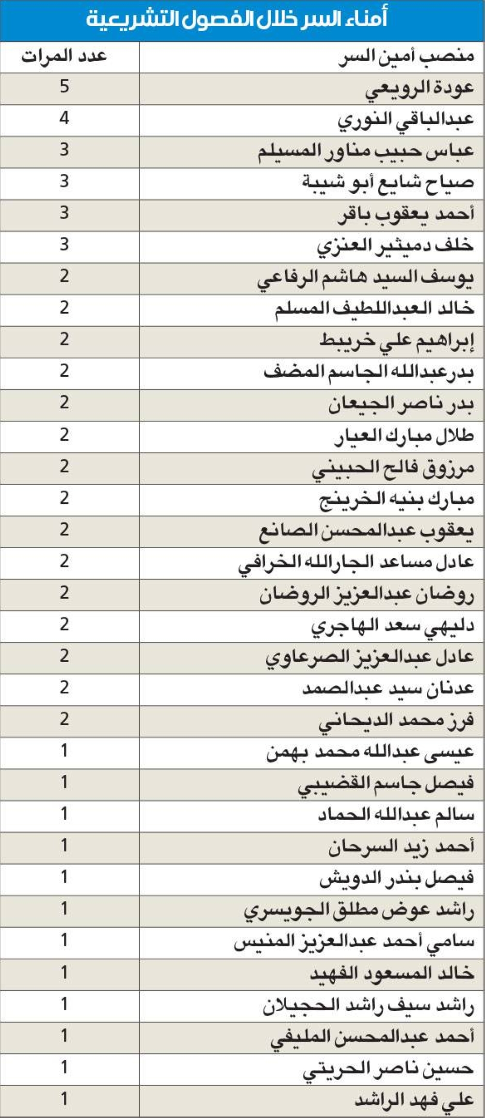 وجاء النائب السابق د. عودة الرويعي في صدارة من تولوا المنصب، حيث فاز به في 5 أدوار انعقاد، يليه النائب عبدالباقي النوري بـ 4 أدوار، كما تولى المنصب في 3 أدوار 4 نواب، وهم عباس مناور، وصياح أبوشيبة، وأحمد باقر، وخلف دميثير، وتولى المنصب مرتين 14 نائبا، و13 نائبا مرة واحدة.