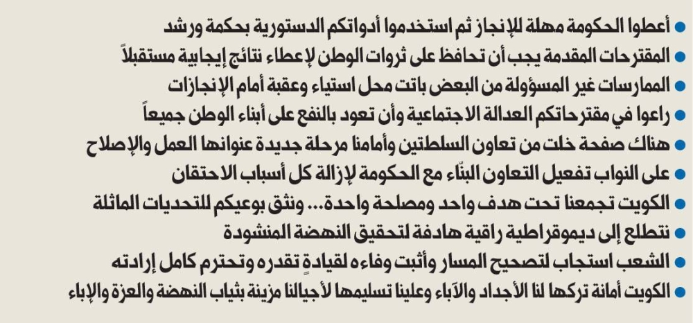 وعليكم الارتقاء بالممارسة الديموقراطية والتركيز على تعزيز دور مجلس الأمة الرقابي وتفعيل دوره التشريعي بما يحقق طموح المواطنين وتطلعاتهم، وإعطاء الحكومة مهلة كافية للإنجاز ثم استخدام الوسائل الدستورية بحكمة ورشد إذا كان لها محل والارتقاء بالخطاب البرلماني لتبقى الكويت - كما عهدها الجميع - نموذجا أصيلا في ممارسة الديموقراطية.
