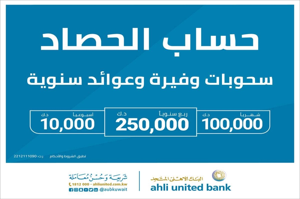 ويقدم حساب الحصاد الإسلامي في باقته الحالية مجموعة أوسع من المزايا، حيث يحظى الرابحون من عملاء «المتحد» بجائزة شهرية بقيمة 100.000 د.ك. بالإضافة إلى 10 جوائز أسبوعية بقيمة 1.000 دينار لكل جائزة. وتبقى الجوائز ربع السنوية الكبرى بقيمة 250.000 د.ك. نقداً للرابح هي أهم ما يطمح إليه العملاء، حيث تمثل لهم فرصة حقيقية لتحقيق حلم العمر. وفضلاً عن هذه الباقة من الجوائز الجذابة، هناك أيضاً أرباح سنوية متوقعة على أساس عقد الوكالة، وهو ما يزيد من جاذبية حساب الحصاد الإسلامي.