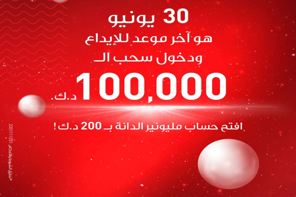 أعلن بنك الخليج أن الفرصة الأخيرة للإيداع والتأهل للفوز بجائزة 100.000 دينار كويتي في سحب مليونير الدانة يوم 30 يونيو الجاري، علماً أنه سيتم إعلان اسم الفائز في 12 أكتوبر المقبل، بحضور ممثلي وزارة التجارة والصناعة، وشركة إرنست أند يونغ. Ernst & Young.