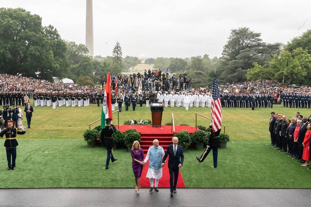 ونقلت الشبكات لقطات حية لمراسم الاستقبال بحضور قرينة الرئيس الأميركي جيل بايدن، ووزير الخارجية أنتوني بلينكن، وعدد من المسؤولين البارزين، وقد استمع الزعيمان لموسيقى السلام الوطني لكل من الهند والولايات المتحدة.