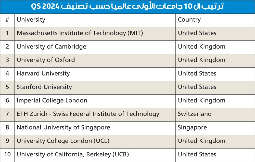 أصدرت مؤسسة QS (Quacquarelli Symonds) العالمية المتخصصة بالتعليم العالي تصنيفها الجامعي العالمي لسنة QS World University Rankings 2024، الذي أعلن عنه رسمياً في 27 يونيو الحالي، ونُشِر على الموقع الرسمي الإلكتروني للمؤسسة Topuniversities.com.