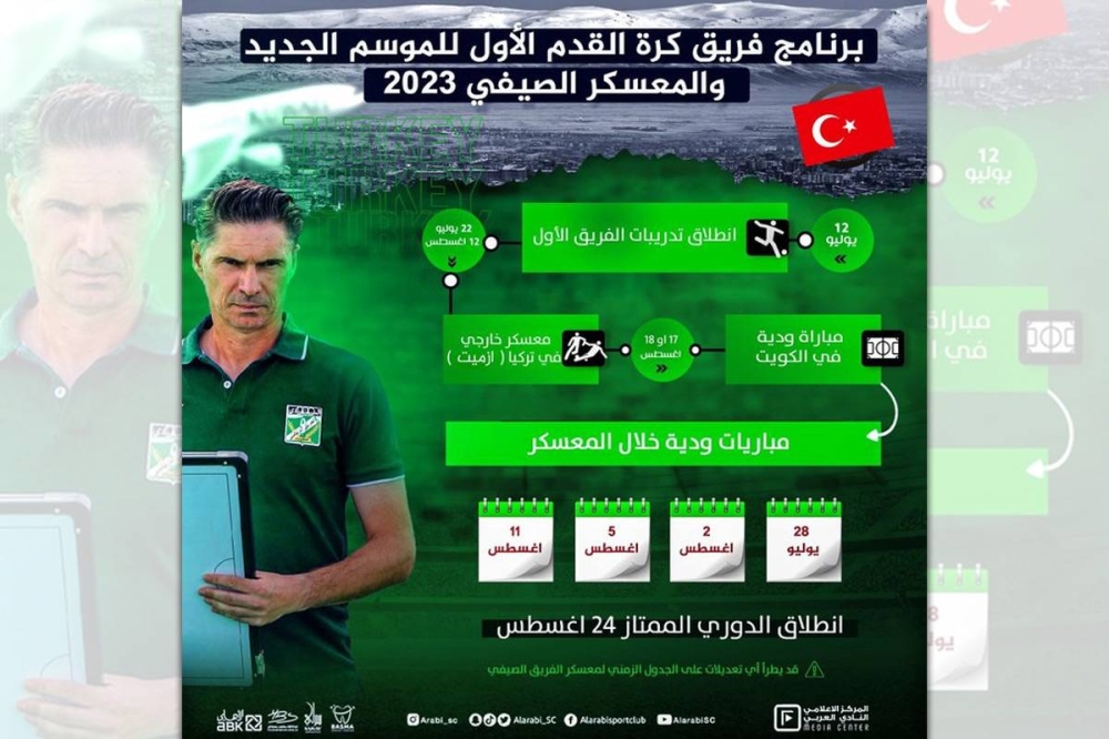 تقرر أن يدشن الفريق الأول لكرة القدم بالنادي العربي تدريباته الأربعاء المقبل، استعداداً لمنافسات الموسم القادم (2023-2024)، والذي ينطلق ببطولة دوري زين الممتاز يوم 14 أغسطس.
