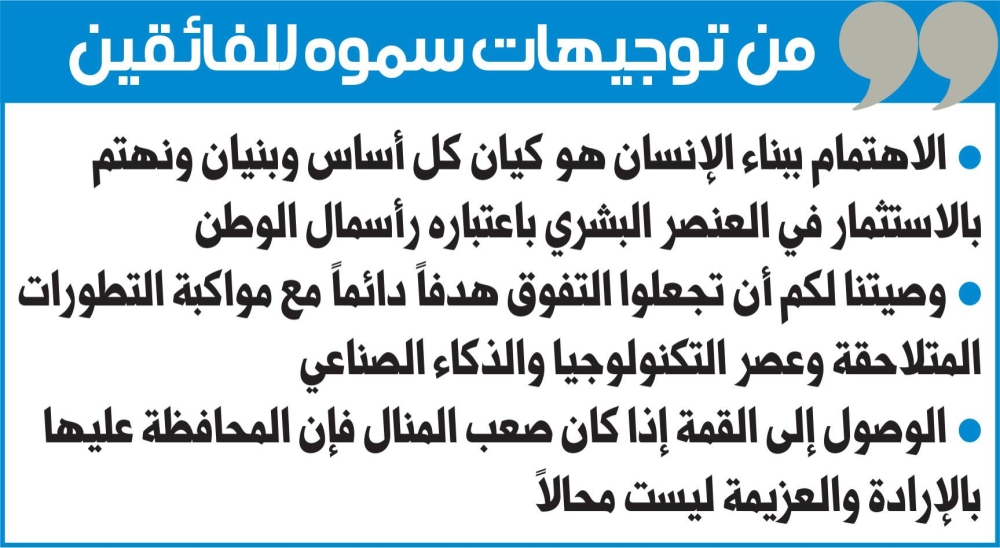 وتابع سموه: وإذ نسجل بالفخر إشادتنا بتفوقكم، فإن وصيتنا لكم أن تجعلوه هدفاً دائماً في مرحلتكم المقبلة، واعلموا أن الوصول إلى القمة إذا كان صعب المنال، فإن المحافظة عليها بالإرادة والعزيمة ليس بالمحال... كما أوصيكم بمواكبة التطورات المتلاحقة في عصر متسارع الوتيرة... عصر التكنولوجيا والذكاء الاصطناعي، فاختاروا التخصصات التي يحتاج إليها وطنكم لتساهموا في نهضته وتقدّمه.